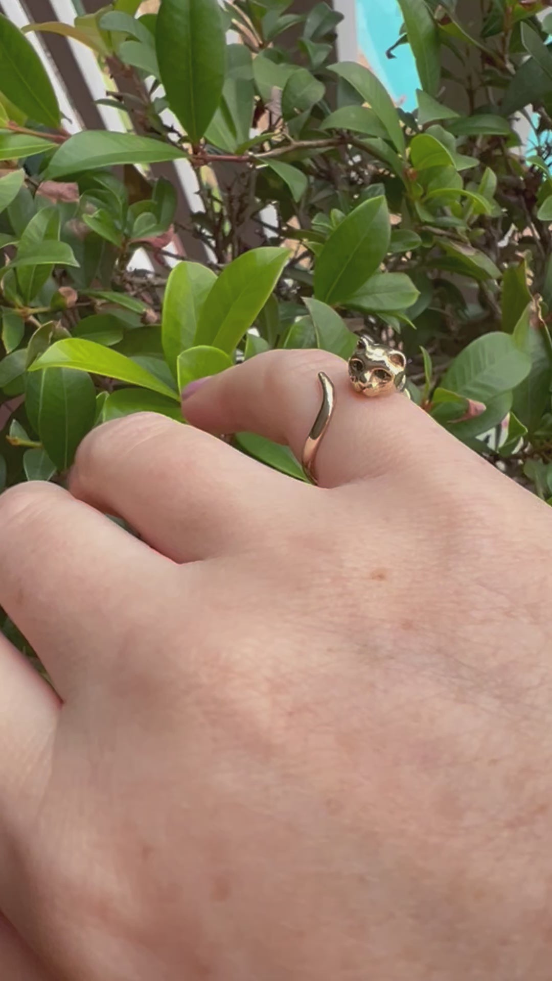 This playful wrap around cat ring has two emerald eyes measuring approximately 1mm and three grain set diamonds on the collar with an approximate total weight of 0.01ct. She looks so cute peering over your finger as if she's about to pounce!