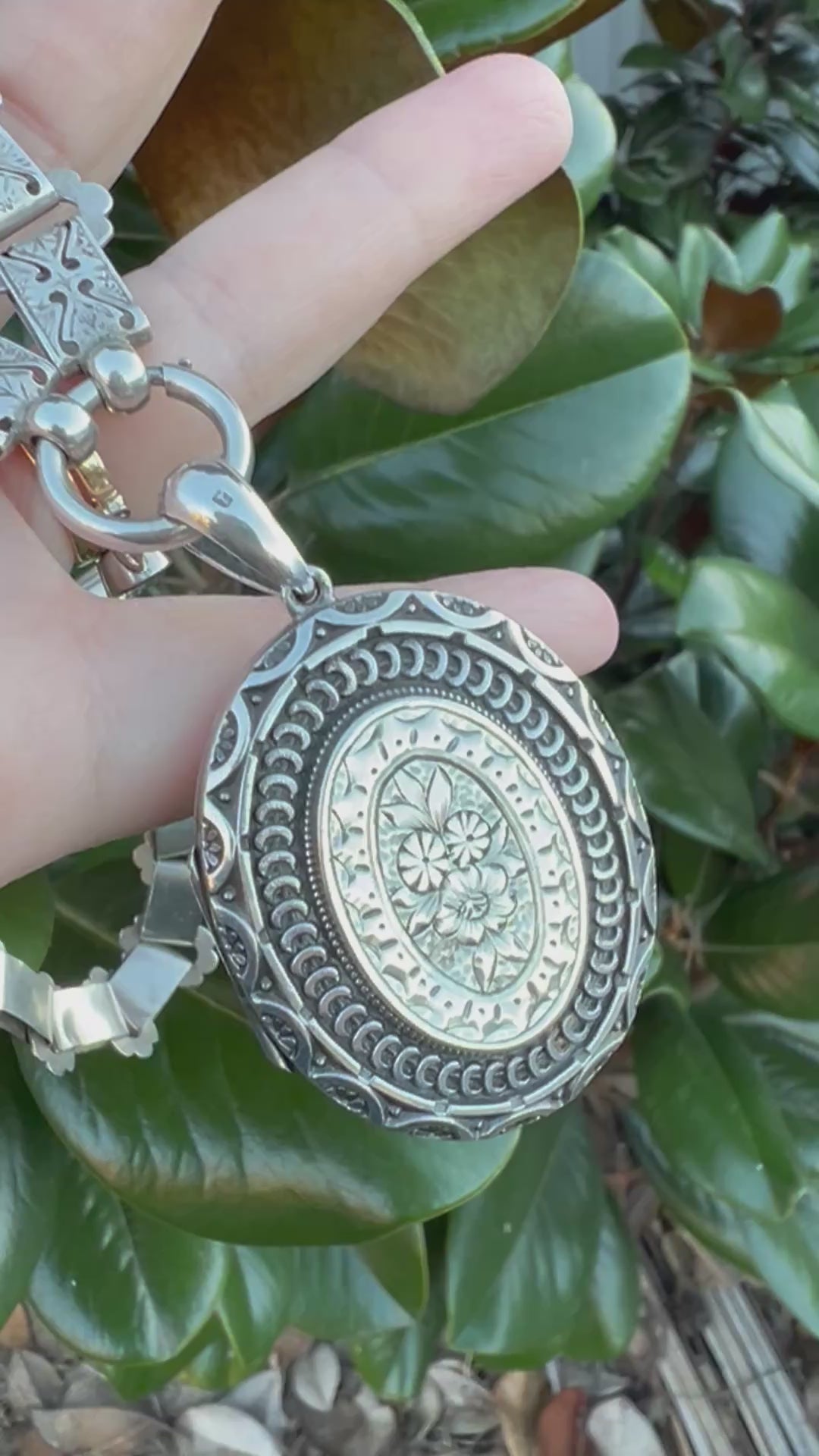 Suspended from the chain, a large bolt ring secures a beautiful oval photo locket, hallmarked for Birmingham 1881. The locket is adorned with a finely engraved central floral plaque, framed by an ornate decorative surround bringing even greater depth and dimension to this romantic antique treasure.