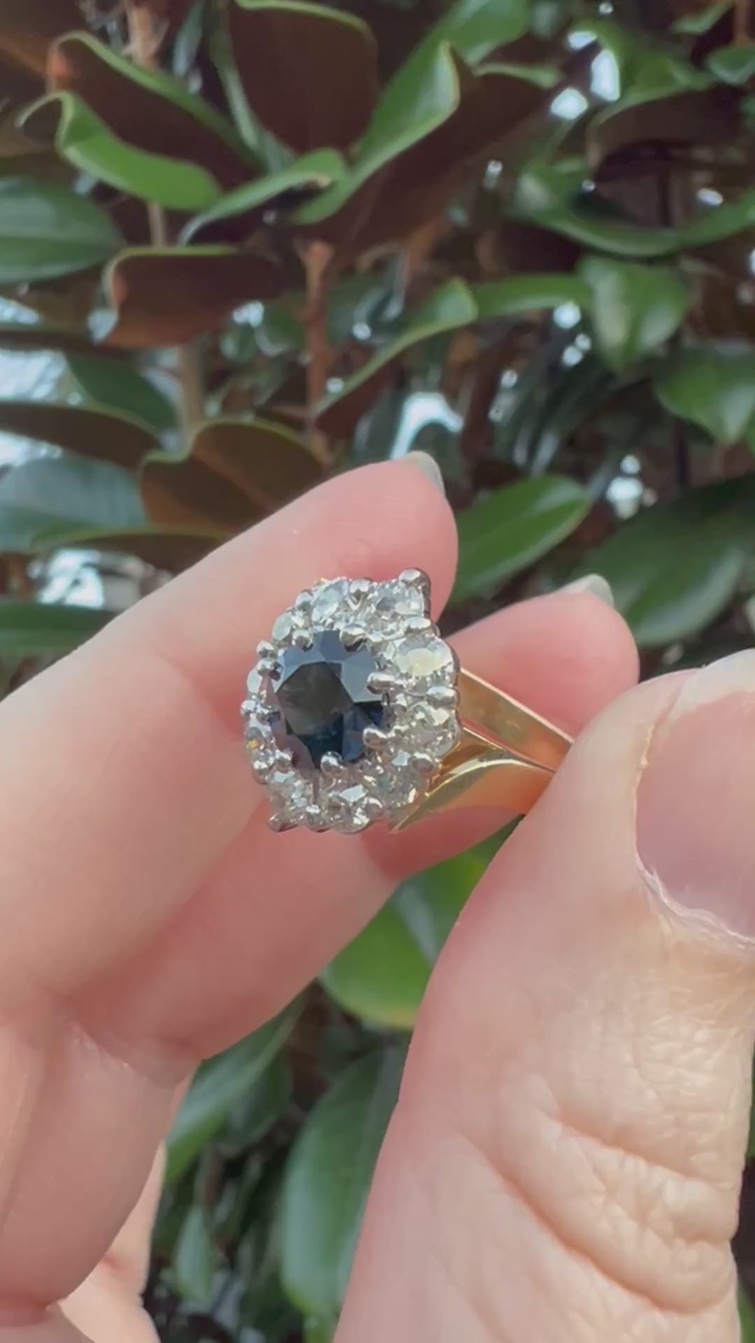There’s so much to love about this stunning vintage handmade ring, crafted in luxurious 18ct yellow and white gold. Featuring a classic vintage setting and some very impressive older stones, its centrepiece is a deep blue, eye-clean cushion cut sapphire, securely held in an elegant eight-claw mount. Surrounding it is a sparkling oval cluster of old cut diamonds, each set to form a distinctive, peaked silhouette.
